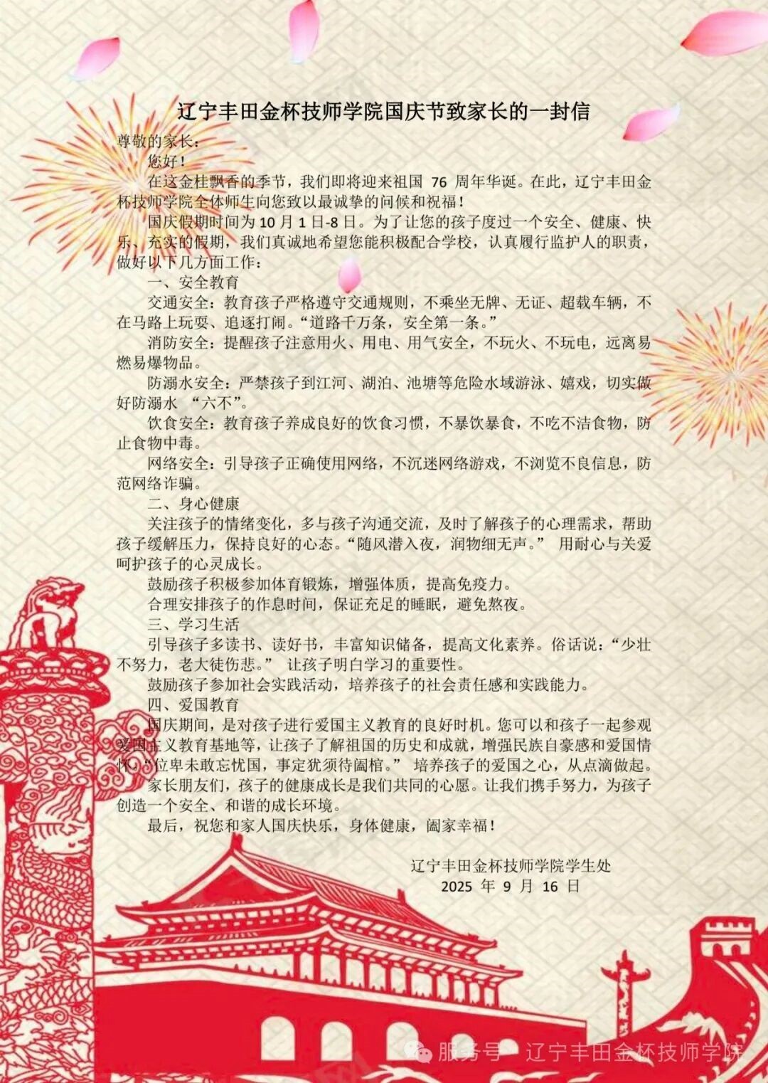 辽宁丰田金杯技师学院国庆节致家长一封信